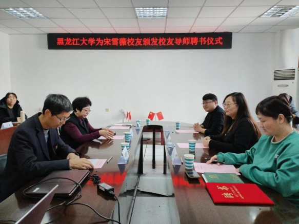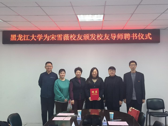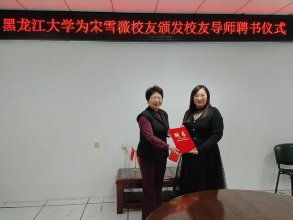 校友服务中心主任杨宇致辞,欢迎宋雪薇校友,感谢宋雪薇校友担任校友导师,为母校做贡献。杨宇主任为宋雪薇校友颁发校友导师聘书并合影留念。