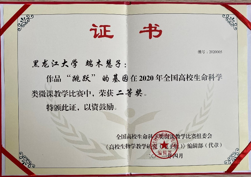 在近期刚刚结束的2020年全国高校生命科学类微课教学比赛中,我院端木慧子副教授的分子生物学微课程《“跳跃”的基因》荣获二等奖第一名的优异成绩。同时在刚刚落幕的黑龙江大学首届微课教学大赛中,端木慧子老师的微课作品获得一等奖,并获得了学校表彰奖励。